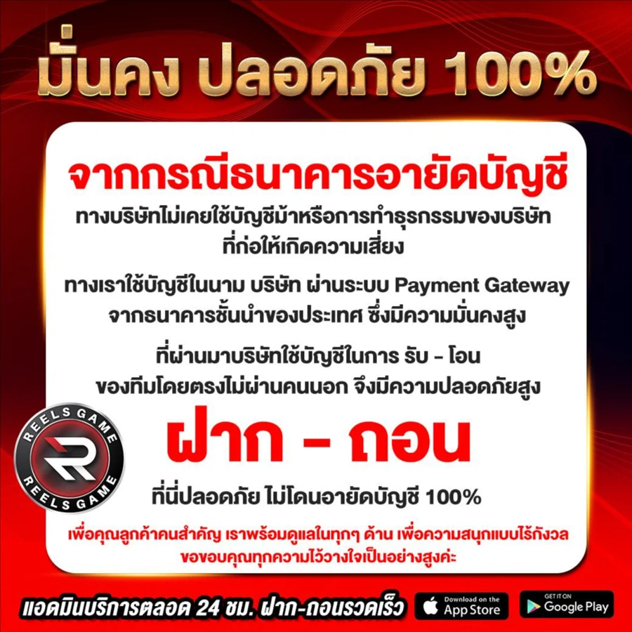 ในด้านความปลอดภัย REELSGAME ได้รับการรับรองจากผู้ให้บริการระดับสากล มีการเข้ารหัสข้อมูลที่ได้มาตรฐาน ทำให้ผู้เล่นสามารถวางใจได้ว่าข้อมูลส่วนตัวและธุรกรรมทางการเงินจะปลอดภัย นอกจากนี้ยังมีทีมซัพพอร์ตคอยให้บริการตลอด 24 ชั่วโมง พร้อมช่วยเหลือเมื่อมีปัญหาหรือข้อสงสัย